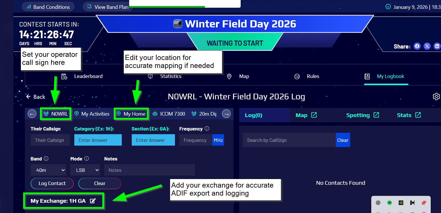 The logbook interface is made for Winter Field Day and already has the section and class included.