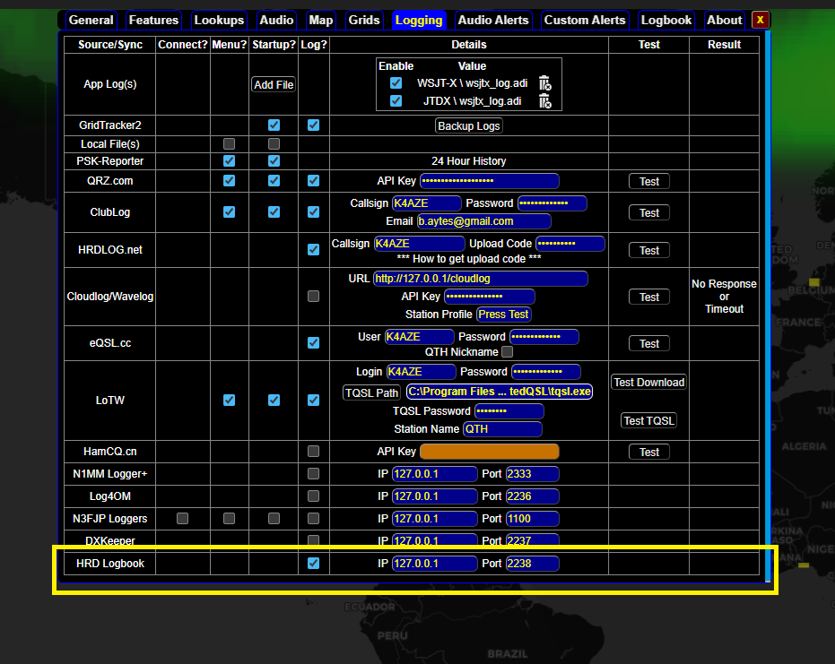 - Go to the settings icon (gear icon) and under the “Logger Integration Settings”, in the ‘WSJTX” tab enter port “2238” and select the WRL Logbook you would like the QSO’s to go into from the “Select Logbook” dropdown.