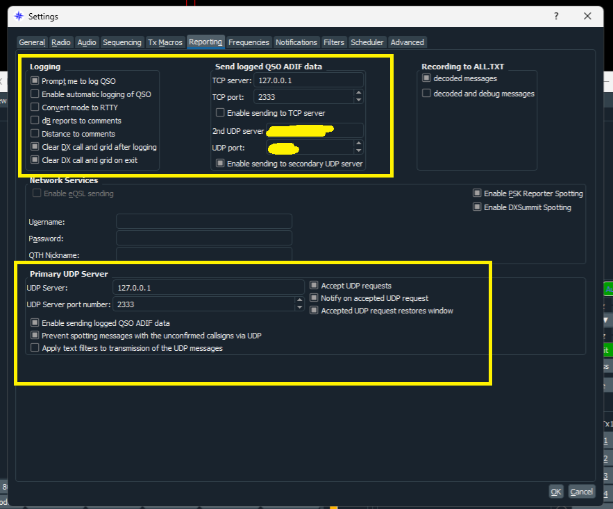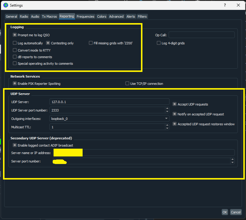 - In the WSJTX “Reporting” settings tab, in the “Logging” section enable “Prompt me to log QSO”