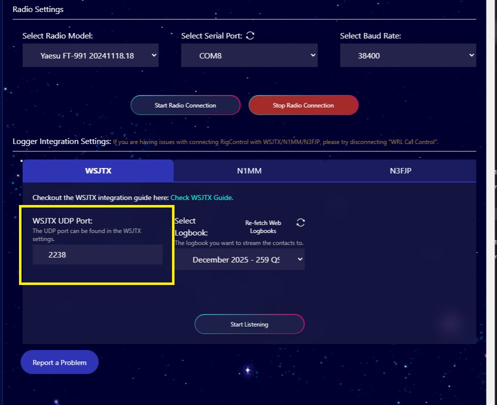 - Start WRL Cat Control & click ‘Start Radio Connection’ (if you’re using rig control), then click the settings icon (gear icon) and click ‘Start Listening’ under the WSJTX tab.
